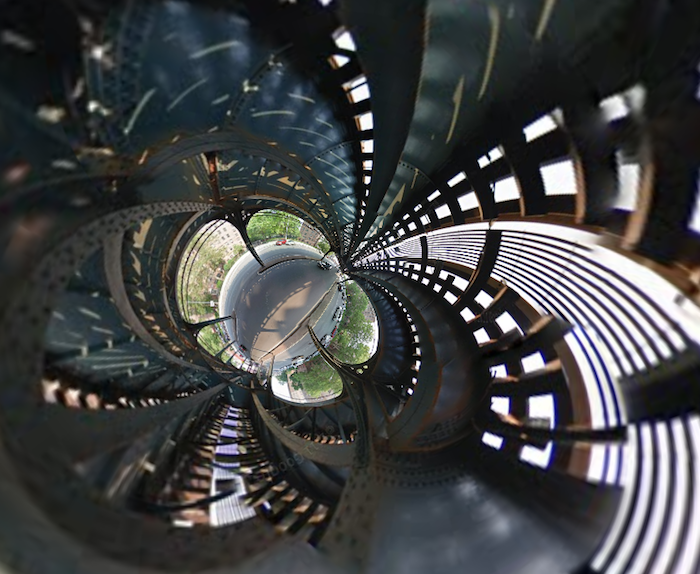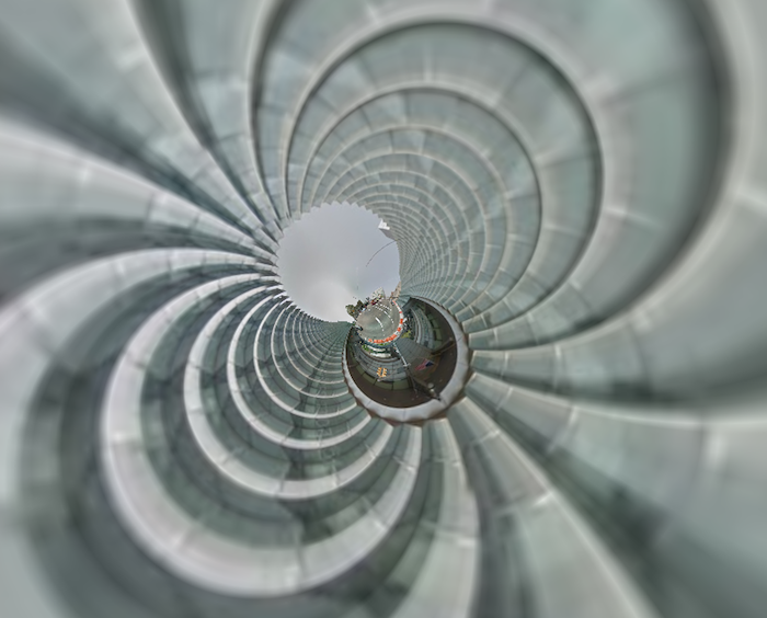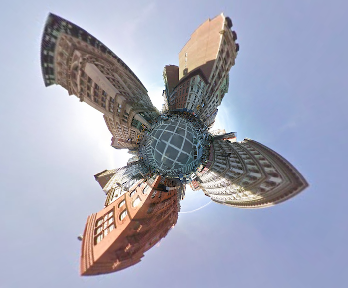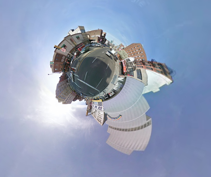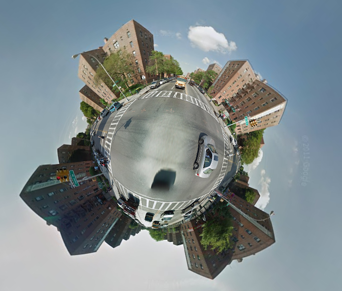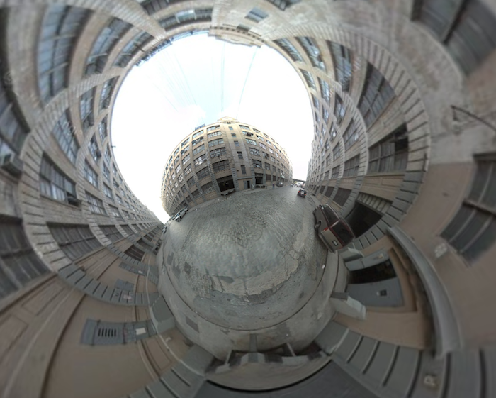 More fun with the Stereographic Street View hack. As it turns out, you can do a lot more than just make those cute little mini-planets. Long, low buildings, for example, can be fun to play around with. Here we are at Industry City in Sunset Park, Brooklyn: